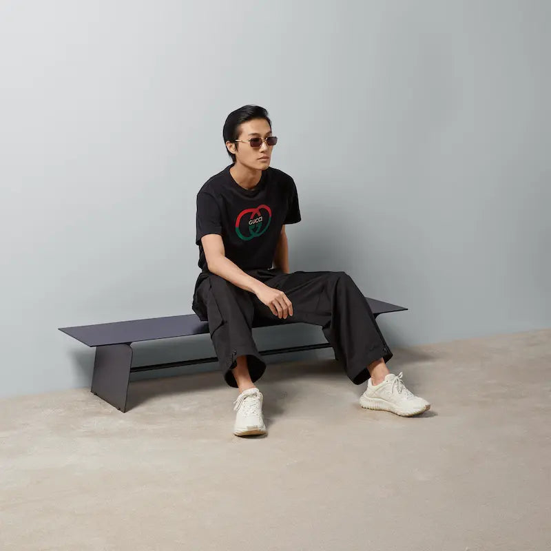 暖かな太陽を歓迎する最新のメンズ コレクションに、鮮やかなプリントをあしらったスポーティーなアイテムが登場。今シーズンもウェブ ストライプがアーカイブデザインを思わせるタッチをプラスし、ロゴ ディテールは大胆で現代的な雰囲気を醸し出しています。このブラックのコットンジャージー TシャツにはインターロッキングG&GUCCI プリントをあしらってコントラストを演出し、存在感を際立たせました。