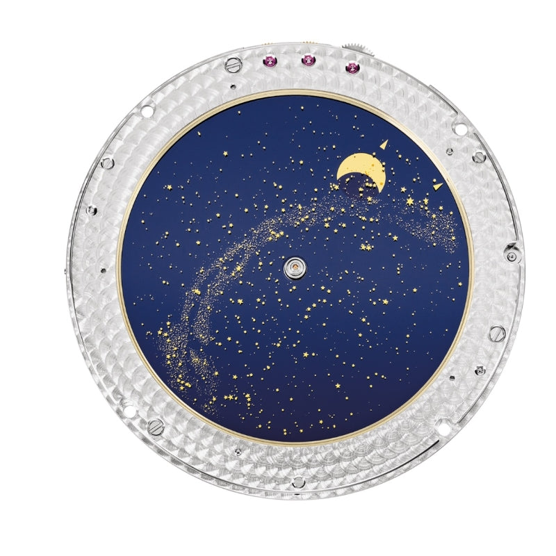 • 文字盤: メタライズされた 3 つのサファイア クリスタル ディスクで構成され、楕円形のフレームがジュネーブの星空の輪郭を描きます。