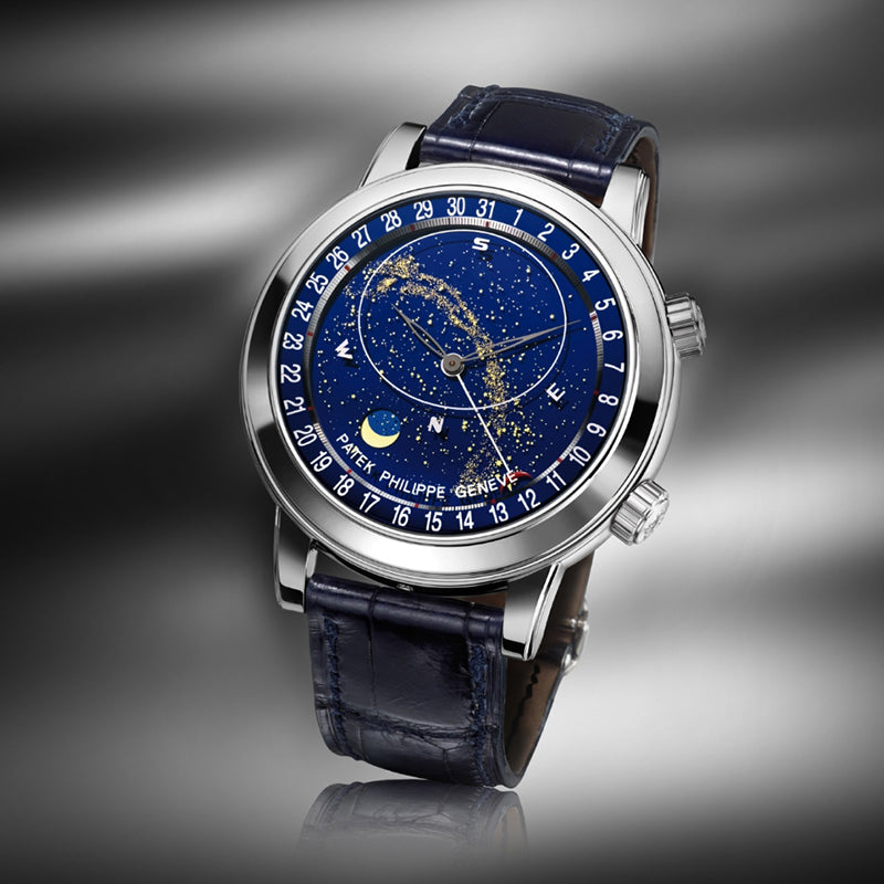 • スターリースカイシリーズの時計の文字盤は天体の素晴らしい動きを鮮やかに再現し、パテック フィリップの天文時計の偉大な伝統を存分に表現しています。所有者はいつでも北半球の星空を鑑賞し、星や月の満ち欠けの変化、月の軌道をはっきりと認識することができます。時間と分を指し示す 2 本のスケルトン針は平均太陽時を表します。サファイアクリスタルの内側表面の楕円は、ジュネーブや同緯度の他の場所から見える空を表しています。