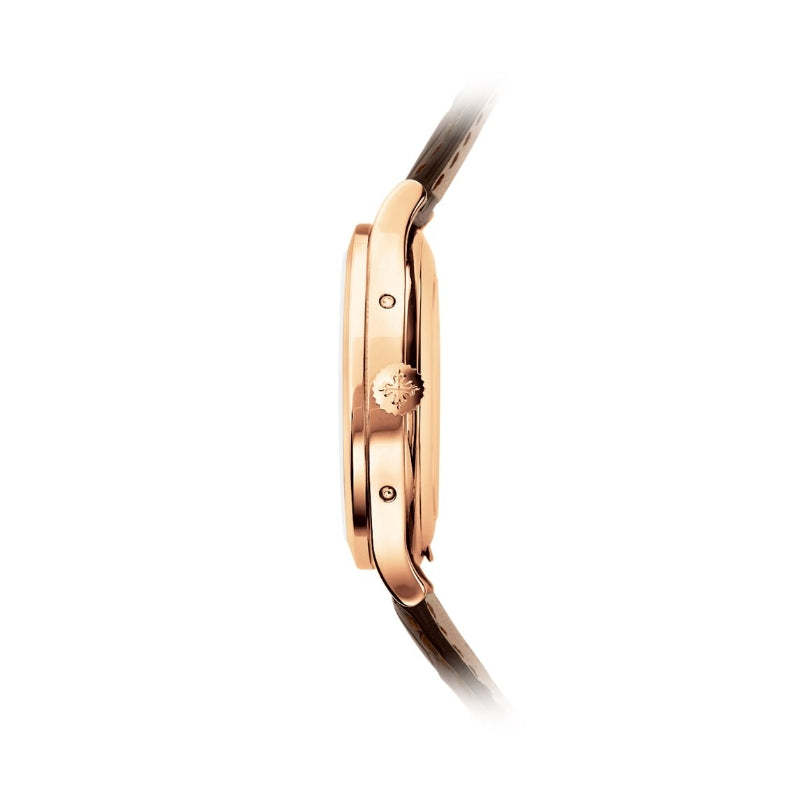 - ケース:ローズゴールド。ケース直径:38.5mm。厚さ:11.2mm。防水レベル:30メートル。サファイアクリスタルのケースバック。