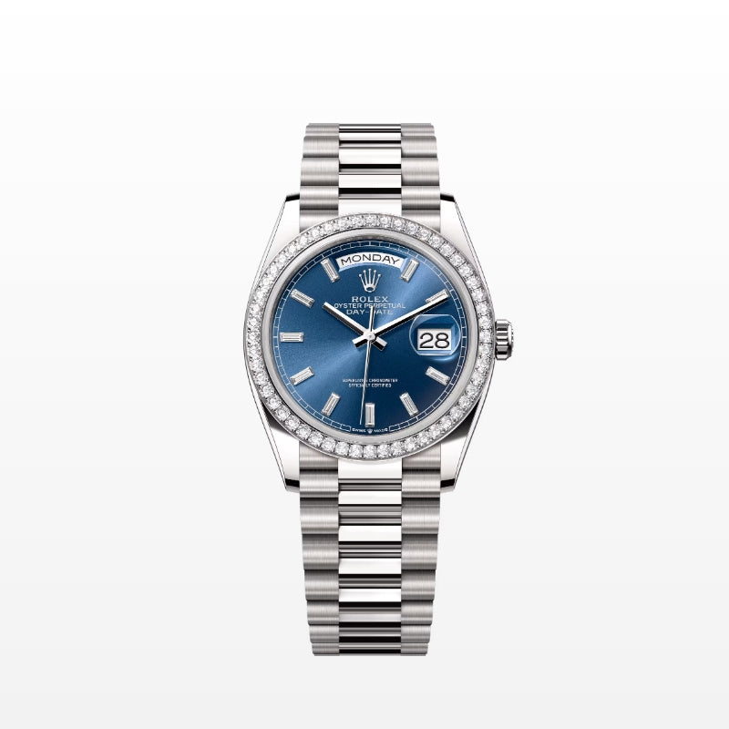18 ct ホワイトゴールドのオイスター パーペチュアル デイデイト 36は、ブライトブルー、ダイヤモンド入りダイアル、ダイヤモンド入りベゼルとプレジデントブレスレットを備える。
