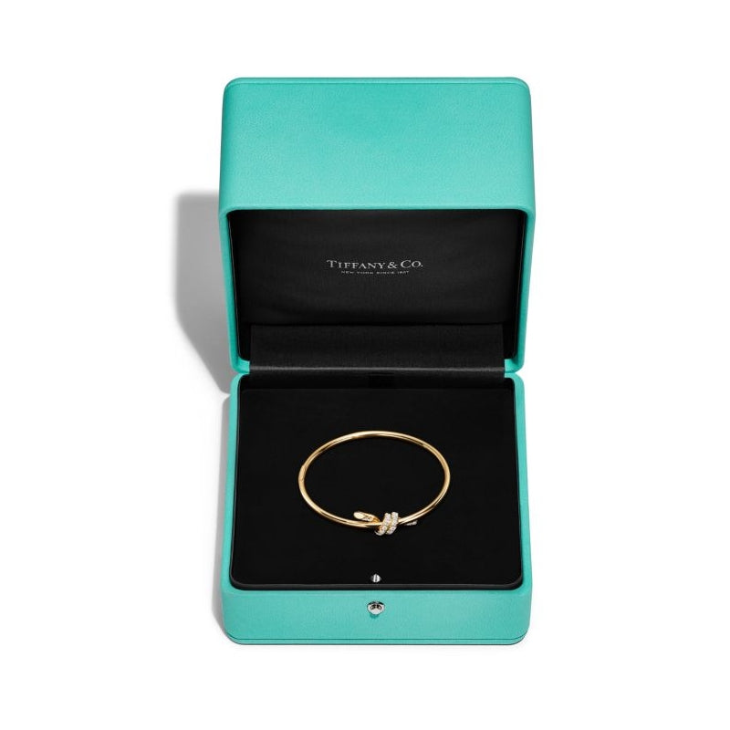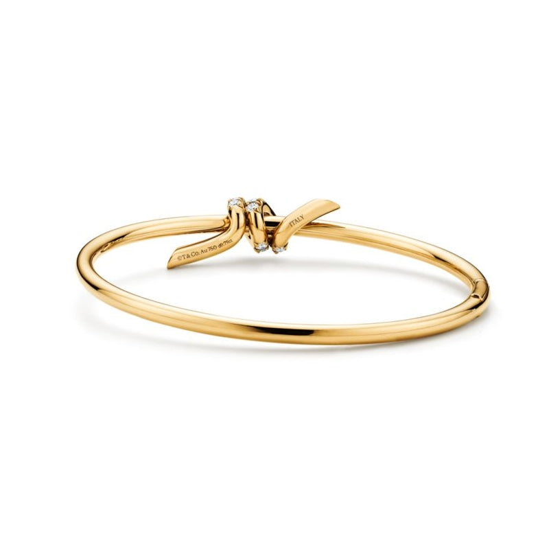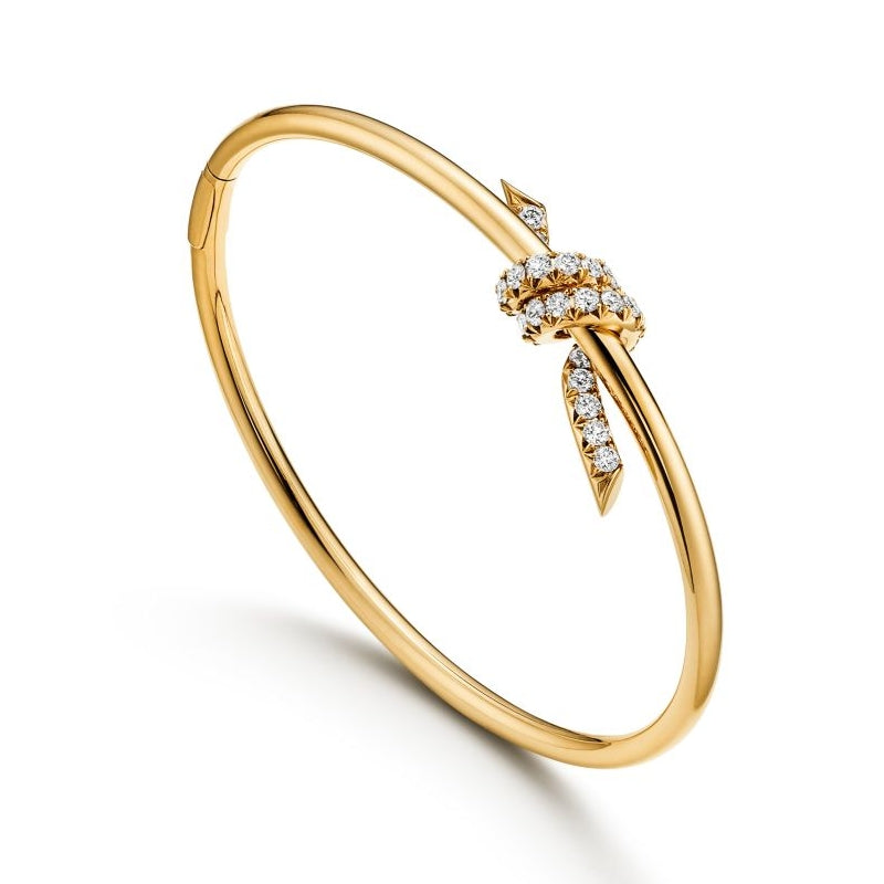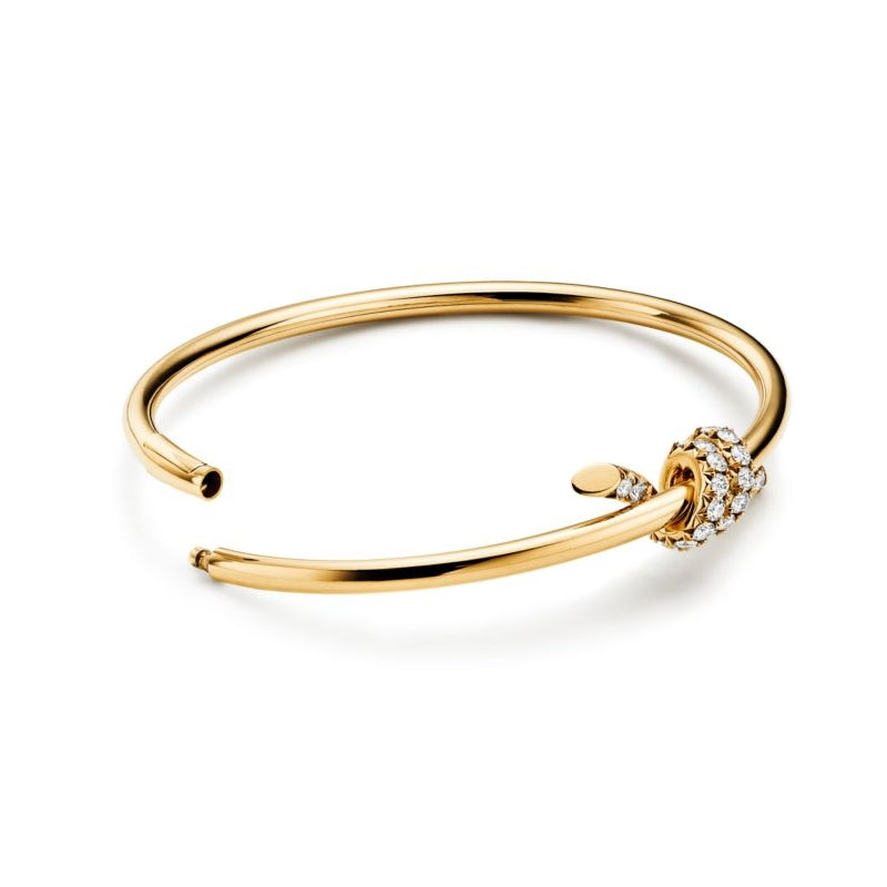 ティファニー ノットは揺るぎない愛の絆を表現しています。1889年に製作されたアーカイブのリボンに着想を得たティファニー ノットは、人生において永遠に紡がれる絆の象徴であり、一人ひとりの大切なつながりを体現しています。艶やかな18K イエローゴールドで作り上げられ、手作業でより一層美しい光沢に磨き上げられたワイヤー バングル。ティファニーの厳格な基準を満たすために厳選された一つひとつのラウンド ブリリアント ダイヤモンドは、輝きを最大限に引き出すために手作業で精巧な角度にセッティングされています。一つで身に着けることも、クラシックなシェイプのバングルとの独創性にあふれた組み合わせを楽しむこともできるデザインです。