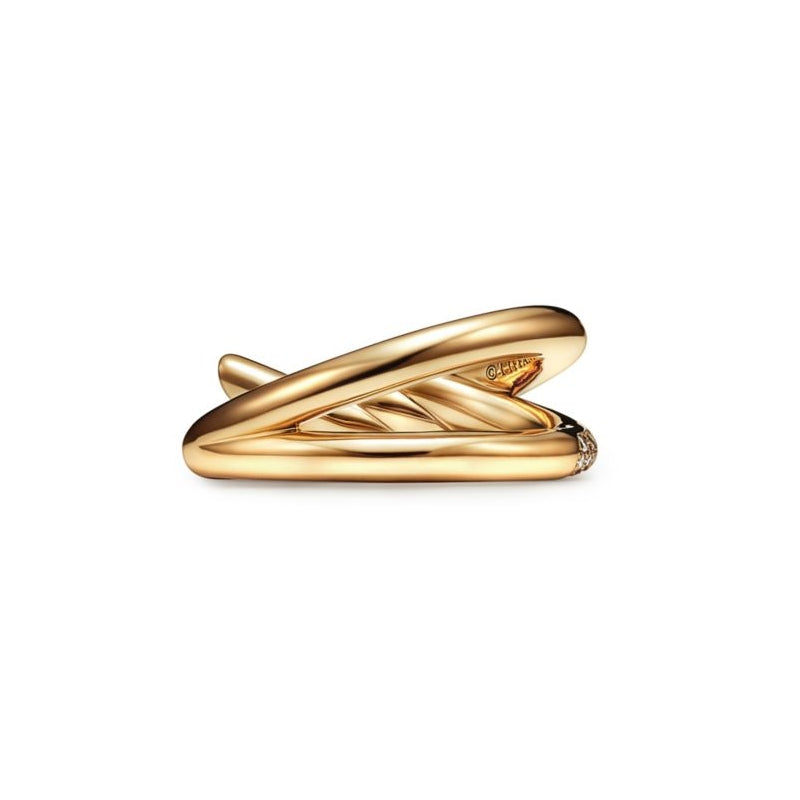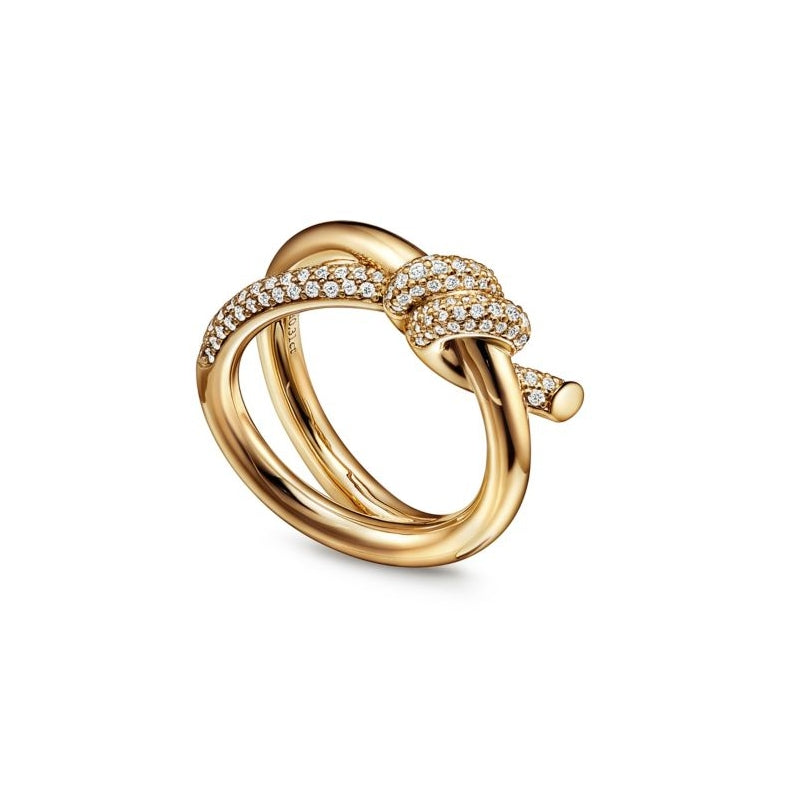 • ティファニー ノットは揺るぎない愛の絆を表現しています。1889年に製作されたアーカイブのリボンに着想を得たティファニー ノットは、人生で最も長く続く絆の象徴であり、一人ひとりの大切なつながりを体現しています。艶やかなイエローゴールドに光り輝くパヴェ ダイヤモンドがあしらわれたこのリングは、手作業でひときわ美しい光沢に磨き上げられています。ティファニーの厳格な基準を満たすために厳選された、一つひとつのラウンド ブリリアント ダイヤモンドは、輝きを最大限に引き出すために手作業で精巧な角度にセッティングされています。一つで身に着けることも、クラシックなシルエットとの意外性にあふれた組み合わせを楽しむこともできるリングです。