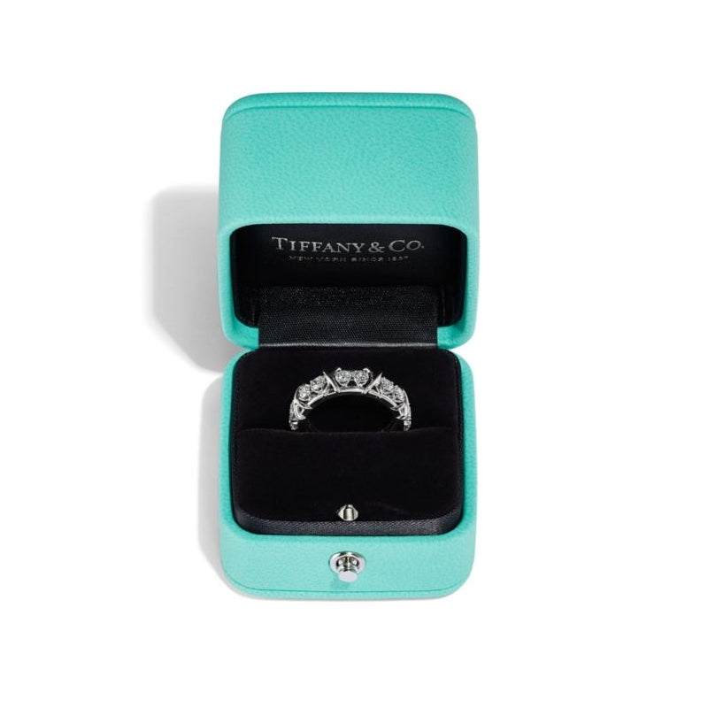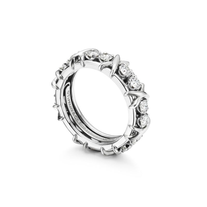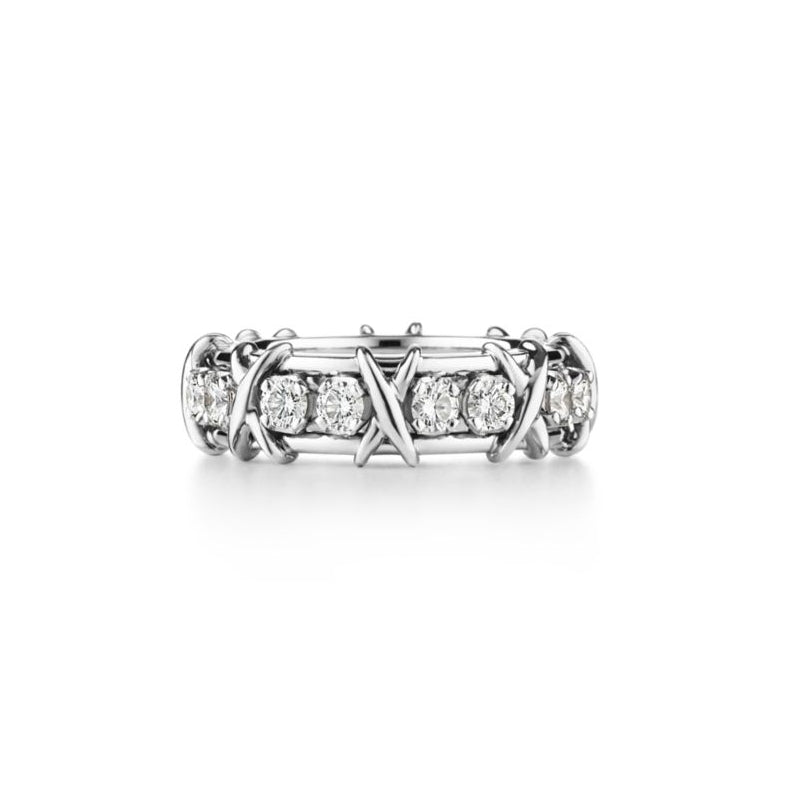 愛が育む力を表現する、Jean Schlumberger by Tiffany 16 ストーンのデザイン。伝説的デザイナーのジャン・シュランバージェが1959年に考案した、このコレクションのクロス ステッチ モチーフは、テキスタイルメーカーの一家に生まれたルーツに着想を得ています。ラウンド ブリリアント ダイヤモンドとプラチナの「X」モチーフが交互にあしらわれた、眩い煌めきを放つデザインです。