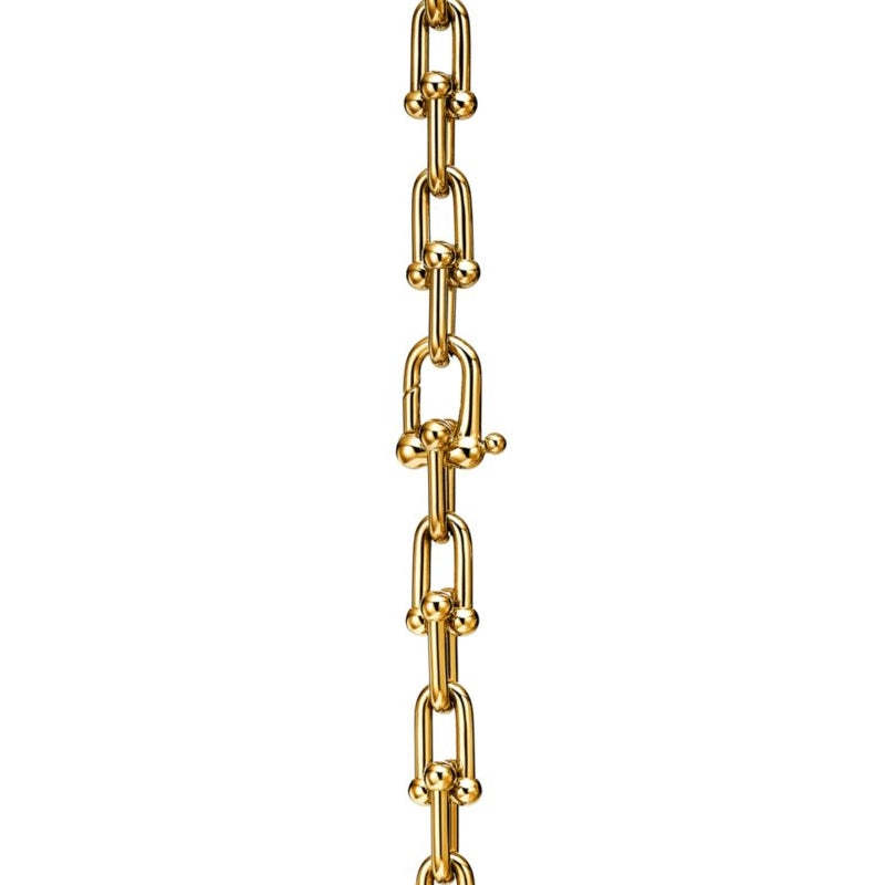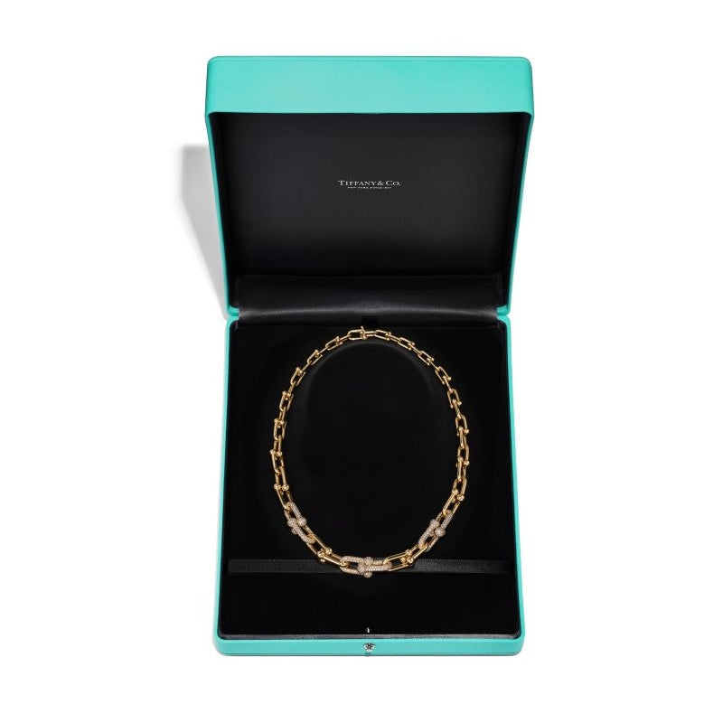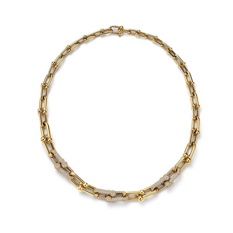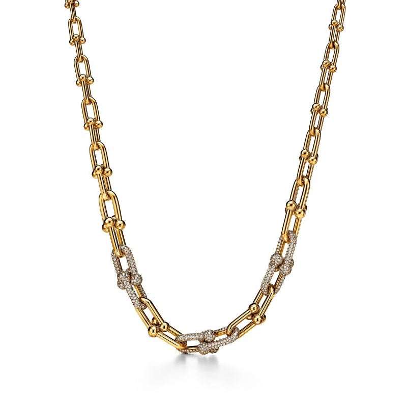 変わり続ける愛の力を表現するティファニー ハードウェア。ティファニーのアーカイブにある1962年製の象徴的なブレスレットに着想を得たティファニー ハードウェアは、不朽のエネルギーと自由奔放な精神を体現しています。この大胆な18K ゴールドのネックレスは、コレクションならではの、少しずつ大きさが異なるゲージ リンクが特徴です。交互に連なるリンクには、ラウンド ブリリアント ダイヤモンドがハニカム パターンに丁寧にセッティングされ、その優美な輝きを最大限に引き出しています。異なる質感の絶妙なコントラストがひときわ目を引くデザインです。