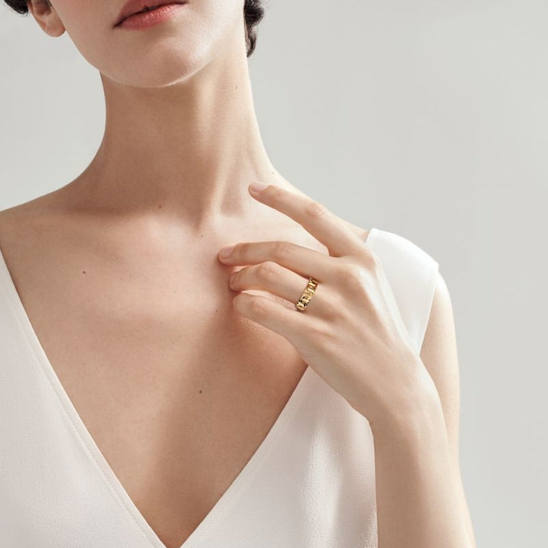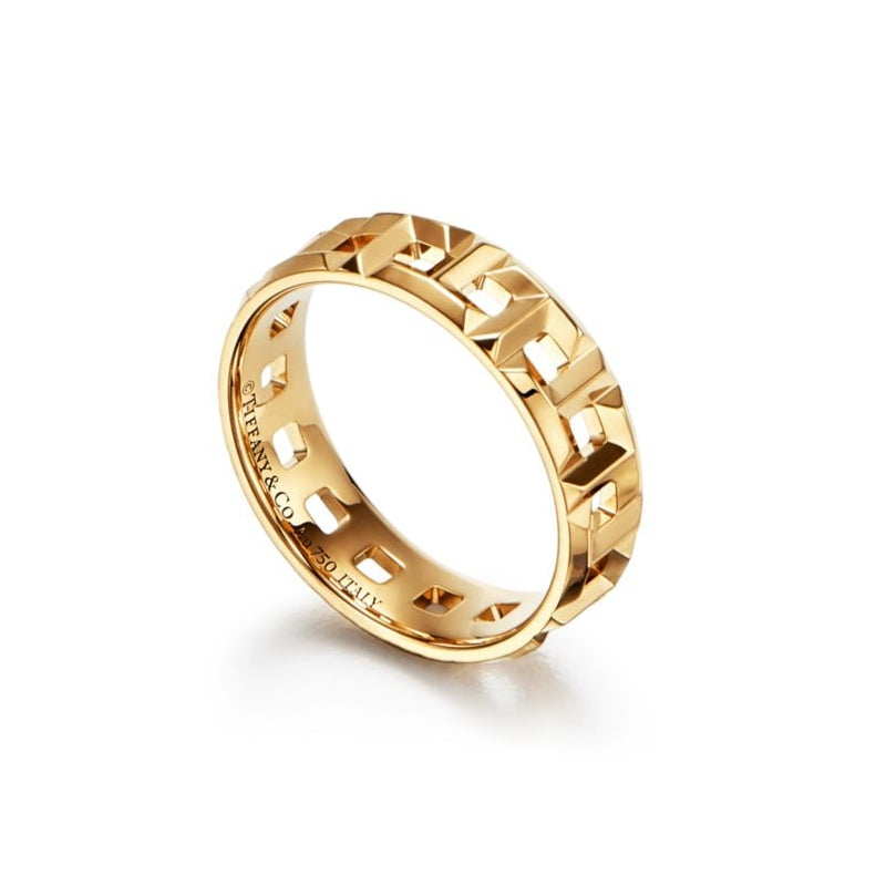 愛がもつ無限の可能性を表現するティファニー T コレクション。1975年製作のアーカイブ ブレスレットに着想を得たティファニー Tは、ティファニーを象徴するモチーフと、創設者であるチャールズ・ルイス・ティファニーが希望と可能性の地であると考えたニューヨークの精神にオマージュを捧げています。大胆な「T」のパターンを交互に織り成す、繊細に絡み合ったリンクが特徴のリングです。