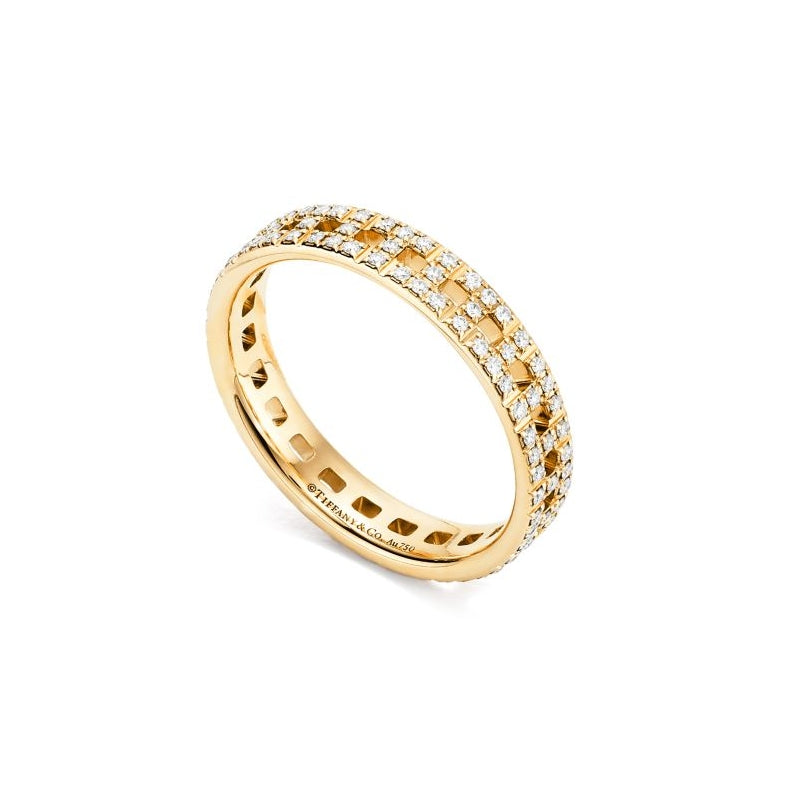 愛がもつ無限の可能性を表現するティファニー T コレクション。1975年製作のアーカイブ ブレスレットに着想を得たティファニー Tは、ティファニーを象徴するモチーフと、創設者であるチャールズ・ルイス・ティファニーが希望と可能性の地であると考えたニューヨークの精神にオマージュを捧げています。大胆な「T」のパターンを交互に織り成すリンクが特徴のリングには、美しい輝きを放つパヴェ ダイヤモンドがちりばめられています。