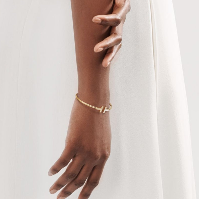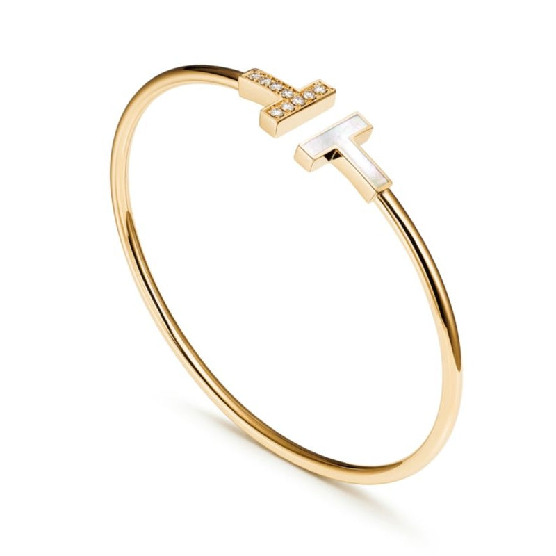 愛がもつ無限の可能性を表現するティファニー T コレクション。1975年製作のアーカイブ ブレスレットに着想を得たティファニー Tは、ティファニーを象徴するモチーフと、創設者であるチャールズ・ルイス・ティファニーが希望と可能性の地であると考えたニューヨークの精神にオマージュを捧げています。自然の恵である真珠貝から採取される、虹色に艶めくマザーオブパールとダイヤモンドが大胆なコントラストを放つ、優美なイエローゴールドのワイヤー ブレスレット。身に着ける人の個性がそれぞれ異なるように、ストーン一つひとつの自然なフォルムが外観に微妙な違いをもたらすユニークなデザインです。この研ぎ澄まされたデザインと、異なるメタルのブレスレットを組み合わせて、印象的なルックを楽しんでみませんか。