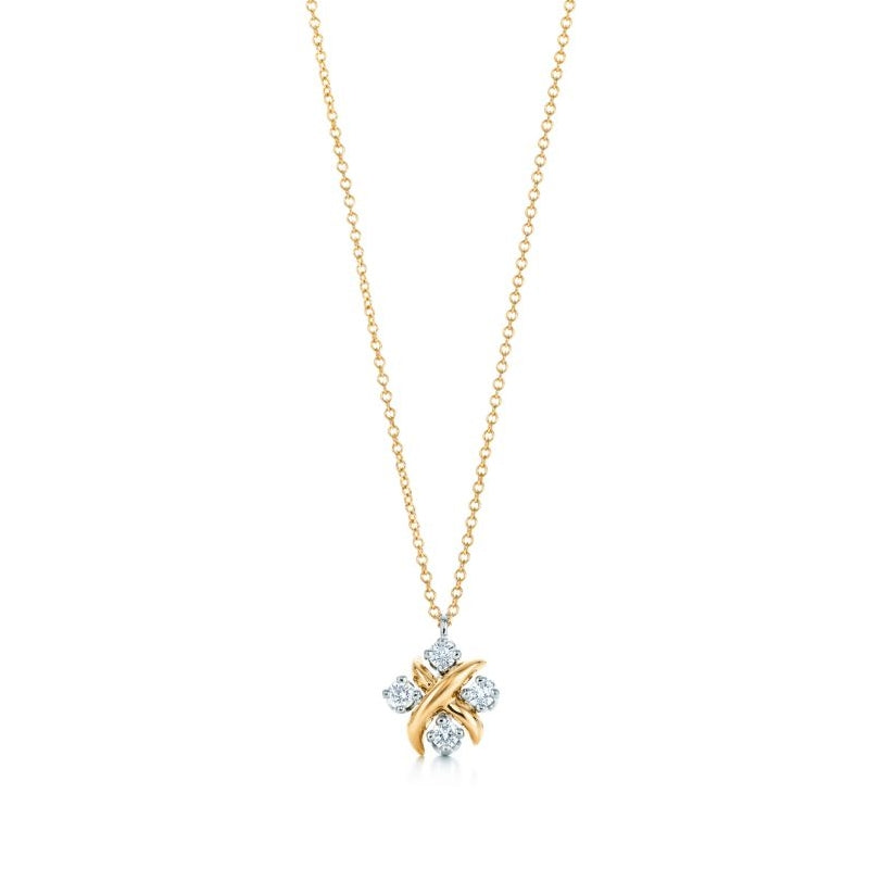 ジャン・シュランバージェの最も代表的なデザインのひとつ。ラウンド ブリリアント カットのダイヤモンドをプラチナにセットしたペンダント。18Kゴールド。チェーンの長さ 約41cm。