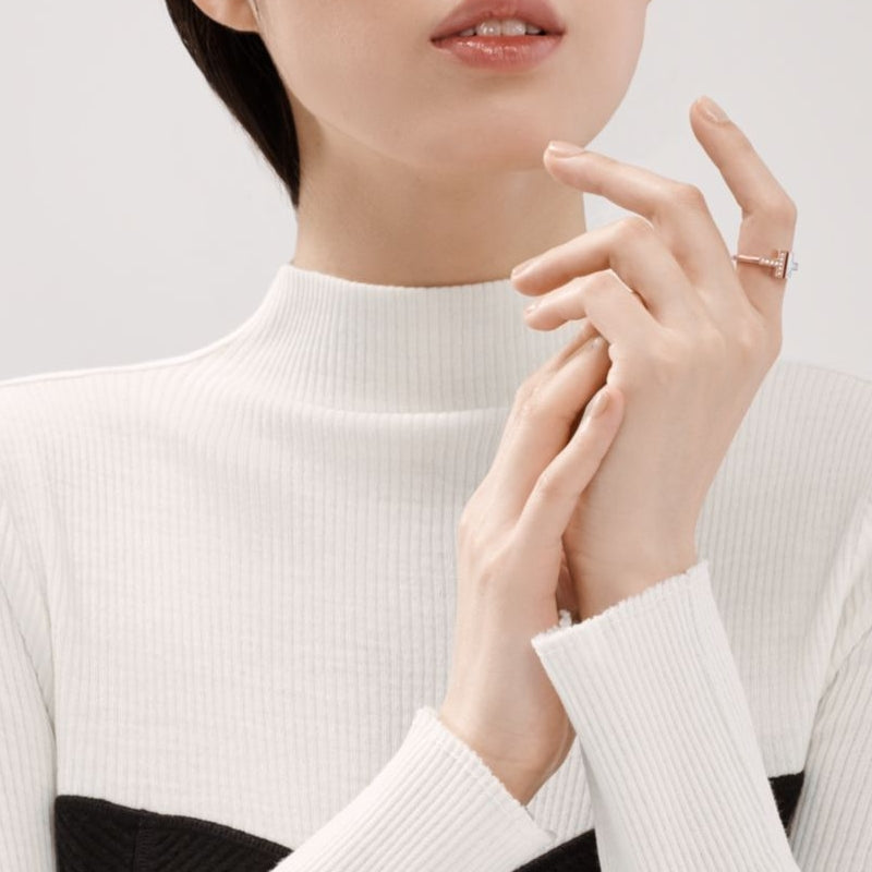 愛がもつ無限の可能性を表現するティファニー T コレクション。1975年製作のアーカイブ ブレスレットに着想を得たティファニー Tは、ティファニーを象徴するモチーフと、創設者であるチャールズ・ルイス・ティファニーが希望と可能性の地であると考えたニューヨークの精神にオマージュを捧げています。大胆な「T」のデザインにあしらわれた、優美にきらめくダイヤモンドと、真珠貝から採られた自然な虹色光沢のマザーオブパール。そのまばゆい光沢とエレガントな輝きで、ひときわ存在感を放つリングです。このワイヤー リングは、バラエティ豊かなティファニーのリングと組み合わせたモダンなルックや、シンプルに単独で身につけて楽しめます。